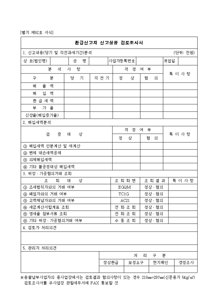 9,000원/월제92호 환급 신고자 신고 상황 검토조사서 양식입니다. 신고내용(당기 및 직전과세기간) 분석, 매입세액분석, 위장.가공협의거래 조회, 검토자 처리의견, 관리자 처리의견 등을 기재합니다.