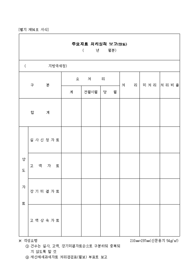9,000원/월제94호 주요 자료 처리 실적보고(양도) 양식입니다. 구분에 따른 요처리(계, 전월이월, 당월), 처리, 미처리, 처리비율 등을 기재합니다.