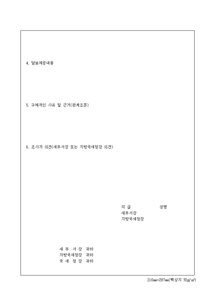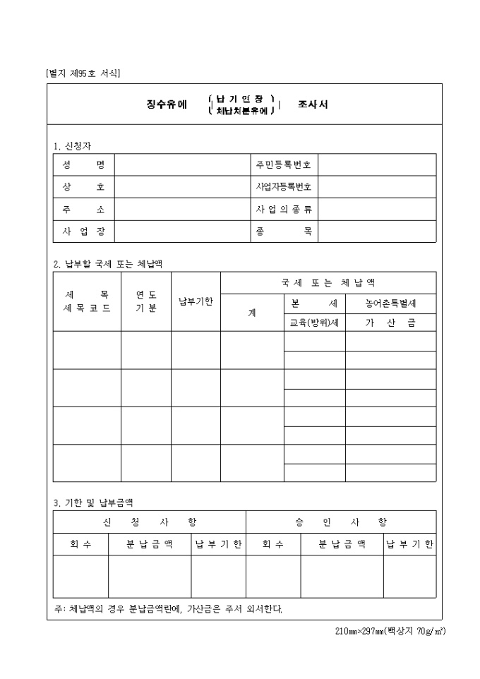 9,000원/월제95호 징수유예(납기연장 체납처분유예)조사서 양식입니다. 신청자, 납부할 국세 또는 체납액, 기한 및 납부 금액, 담보제공내용, 구체적인 사유 및 근거, 조사자 의견 등을 기재합니다.