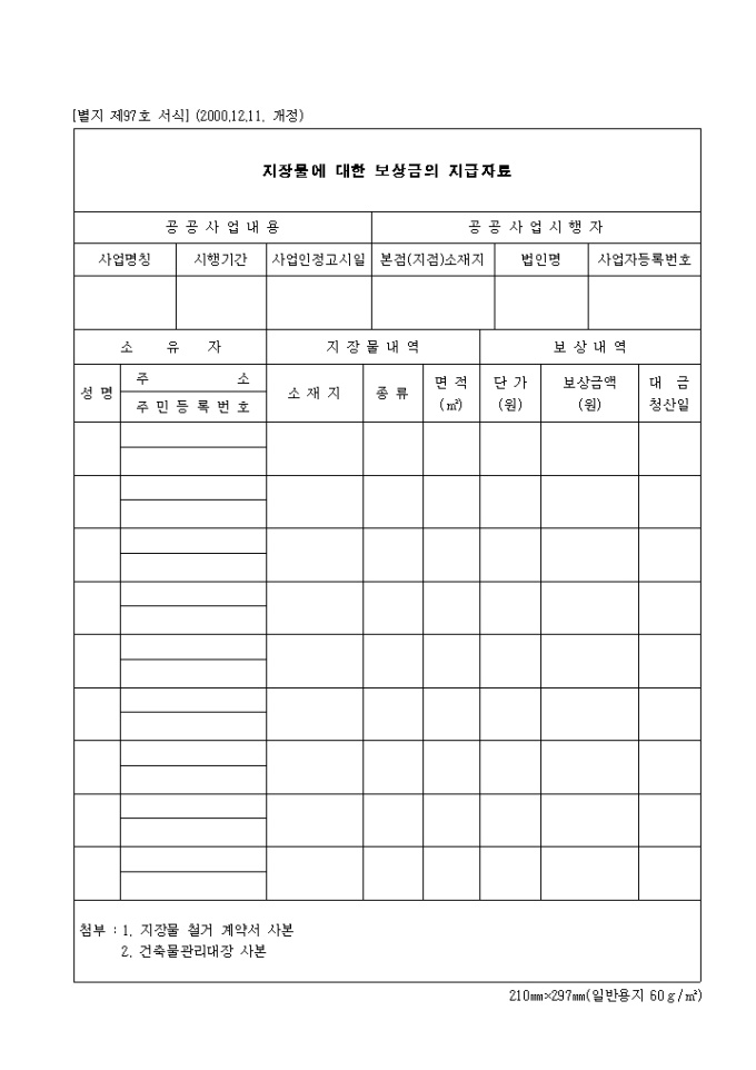 9,000원/월제97호 지장물보상금수집자료명세서(2000.12.11. 개정) 첨부 : 1. 지장물 철거 계약서 사본 2. 건축물관리대장 사본