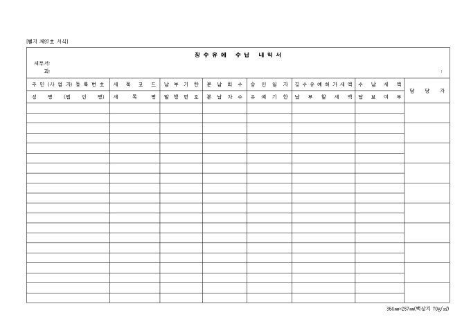 9,000원/월제97호 징수유예수납 내역서 양식입니다. 주민 등록번호, 세목코드, 납부기한, 분납회수, 성명, 세목명, 발행번호, 분납차수, 유예기한 등을 기재합니다.