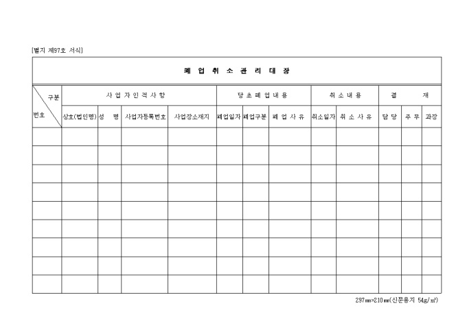 9,000원/월제97호 폐업 취소 관리대장 양식입니다. 사업자인적 사항(상호, 성명, 사업자 등록번호, 사업장 소재지), 당초 폐업내용(폐업일자, 폐업구분, 폐업사유), 취소내용(취소일자, 취소사유), 결재(담당, 주무, 과장) 등을 기재합니다.