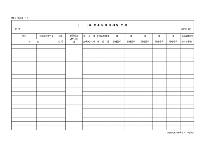 9,000원/월상호, 사업자등록번호, 세목, 발행번호, 납부기한, 내국세, 농어촌특별세 등을 기록하는 관리하는 제98호 월징수유예업체별현황 양식입니다.