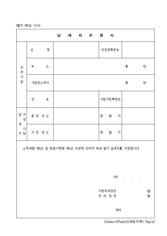 제9호 납세지지정서 양식입니다. 인적사항(성명, 주민등록번호, 주소, 사업장 소재지, 상호, 사업자등록번호), 납세지 지정 사항(종전 장소, 관할서, 지정 장소, 관할서) 등을 기재합니다.