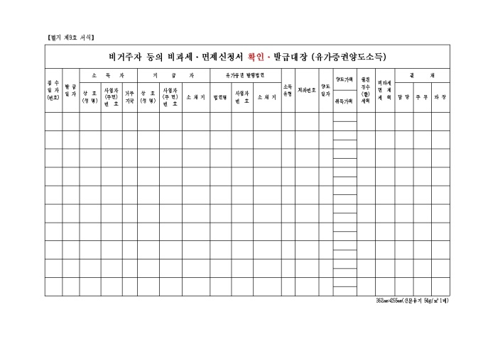 9,000원/월제9호 비거주자등의비과세 면제 신청서 확인 발급 대장(유가증권양도소득)양식입니다. 접수일자, 발급일자, 소득자, 지급자, 유가증권, 발행법인, 소득 유형, 계좌번호, 양도 일자, 원천징수 세액 등을 기재합니다.