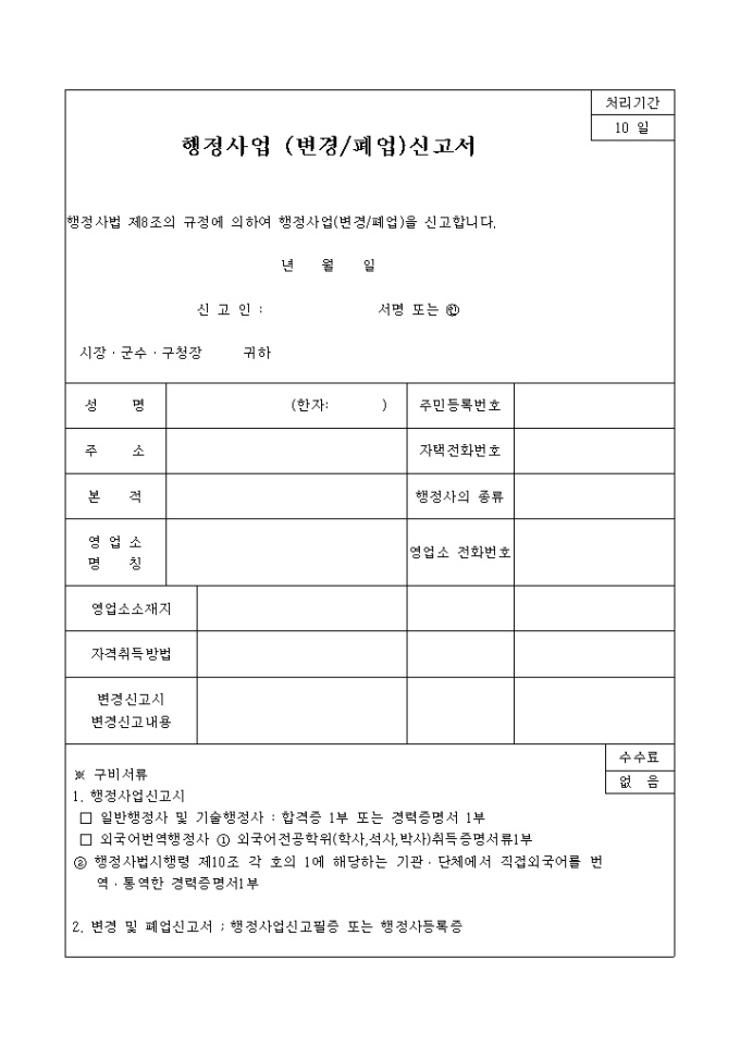 행정사법 제8조의 규정에 의하여 행정사업(변경/폐업)을 신고할때 사용하는 양식입니다.