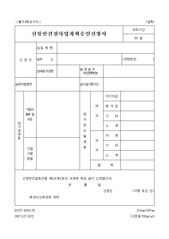 9,000원/월신항만건설촉진법 제8조제1항의 규정에 위와 같이 신청하고자 할 때 사용하는 신항만 건설사업 계획 승인신청서 양식입니다.