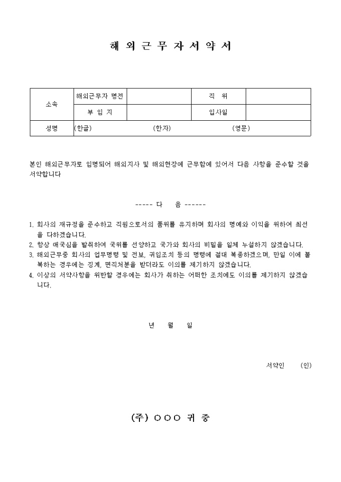 해외 근무자 서약서