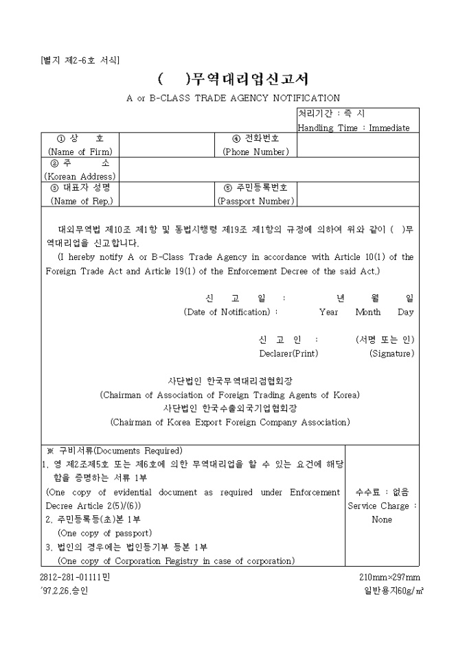 9,000원/월대외무역법 제10조 제1항 및 동법시행령 제19조 제1항의 규정에 의하여 ( )무역대리업을 신고하는 ( )무역대리업신고서 양식입니다.