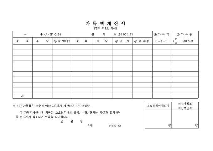 가득액 계산서 양식입니다. 수출품의 품목, 수량, 금액과 원자재의 품목, 수량, 단가, 금액, 가득액, 가득률 등을 기재합니다.