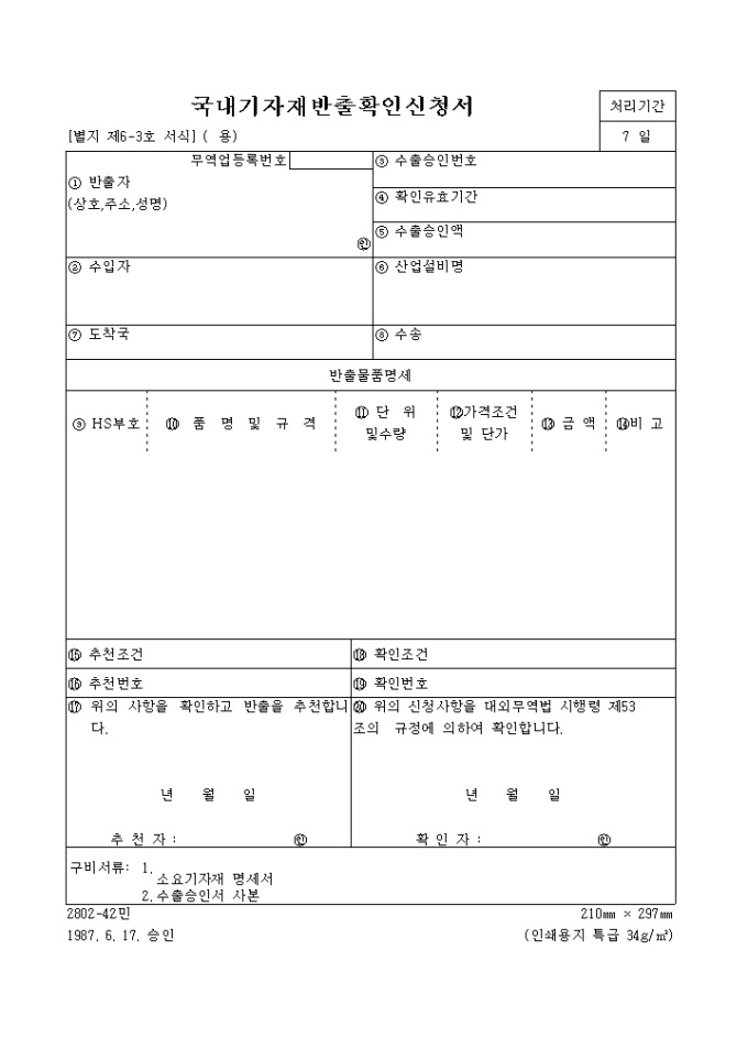 9,000원/월국내 기자재 반출 확인 신청서 양식입니다. 반출자, 수입자, 수출 승인 번호, 확인 유효기간, 수출 승인액, 산업설비명, 도착국, 수송, HS 부호, 품명 및 규격, 단위 및 수량, 가격 조건 및 단가, 금액, 비고, 추천 조건, 추천 번호, 확인 조건, 확인 번호 등을 기재합니다.
