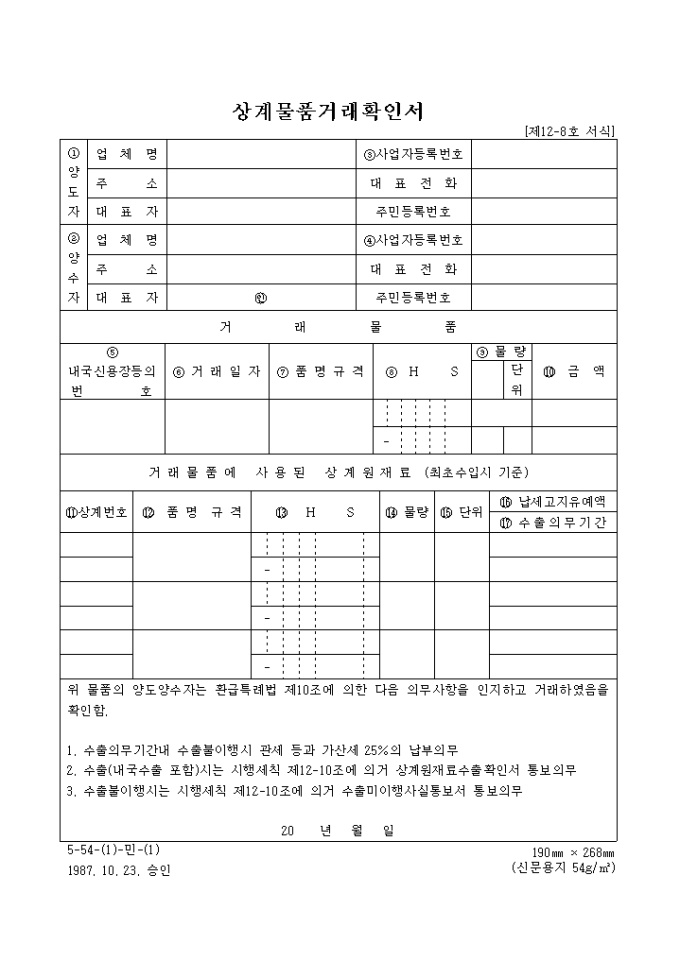 9,000원/월물품의 양도양수자는 환급특례법 제10조에 의한 의무사항을 인지하고 거래하였음을 확인하는 상계물품거래확인서 양식입니다.