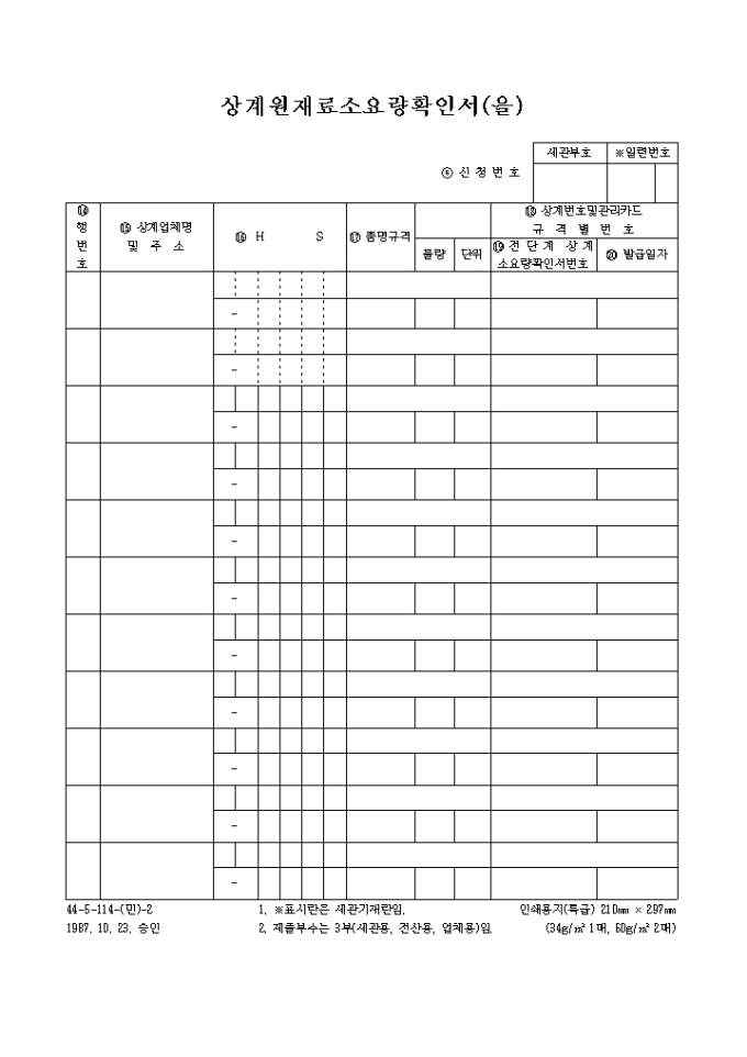 행번호, 상계업체명 및 주소, HS, 품명규격, 상계번호 및 관리카드 규격별번호, 전단계 상계 소요량확인서번호, 발급일자 등을 기록하여 확인하는 상계원재료소요량확인서(을) 양식입니다.