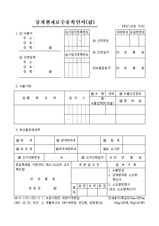 9,000원/월환급특례법 시행세칙 제12-10조에 의거 확인하는 상계원재료수출확인서(갑) 양식입니다.