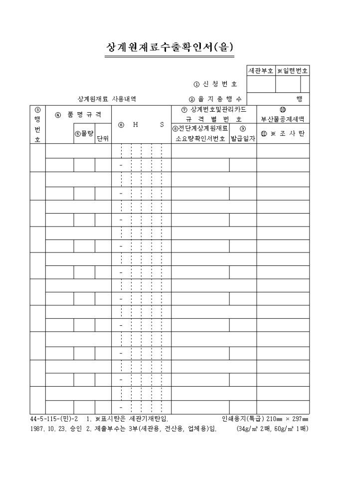 9,000원/월상계 원재료 수출 확인서(을) 양식입니다. 신청번호, 을지 총행수, 행번호, 품명 규격, 물량, HS, 상계번호 및 관리 카드, 전단계 상계 원재료 소요량 확인서 번호, 발급일자, 부산물공제세액, 조사란 등을 기재합니다.