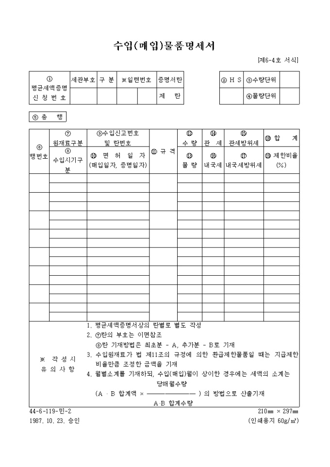 9,000원/월평균세액증명신청번호, HS, 수량단위, 물량단위, 총행, 행번호, 원재료구분, 수입기식구분 등을 기록하고 명세하는 수입(매입)물품명세서 양식입니다.