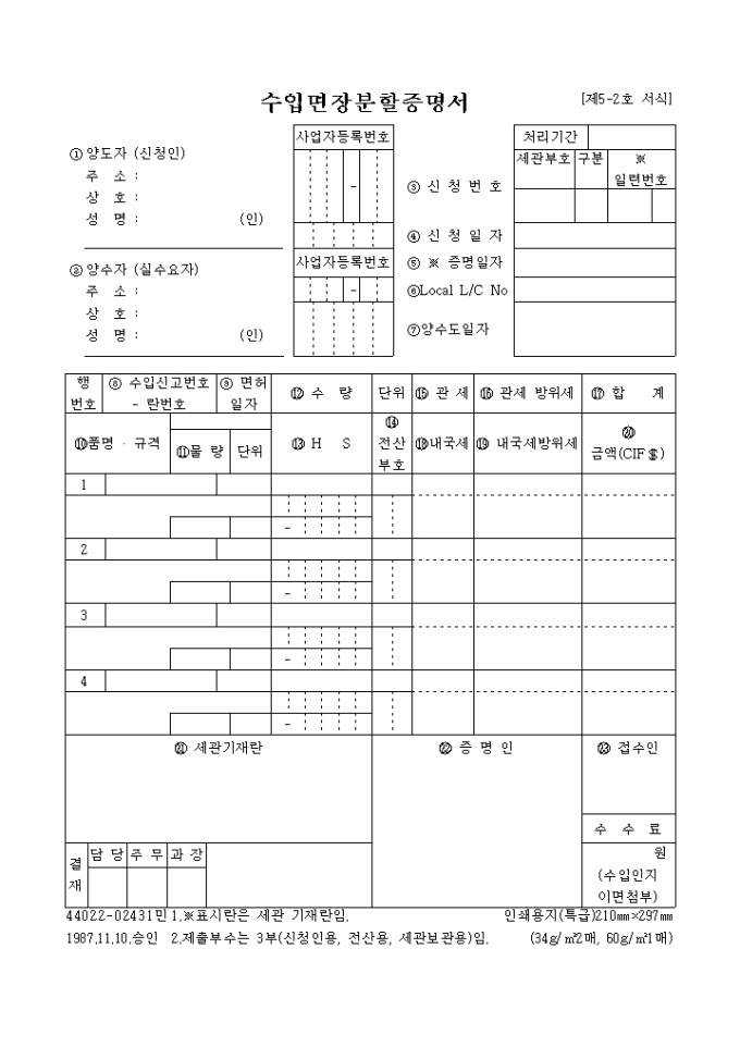 9,000원/월양도자(신청인), 양수자(실수요자), 신청번호, 신청일자, 증명일자, Local L/C No, 양수도일자 등을 기록하여 증명하는 수입면장분할증명서 양식입니다.