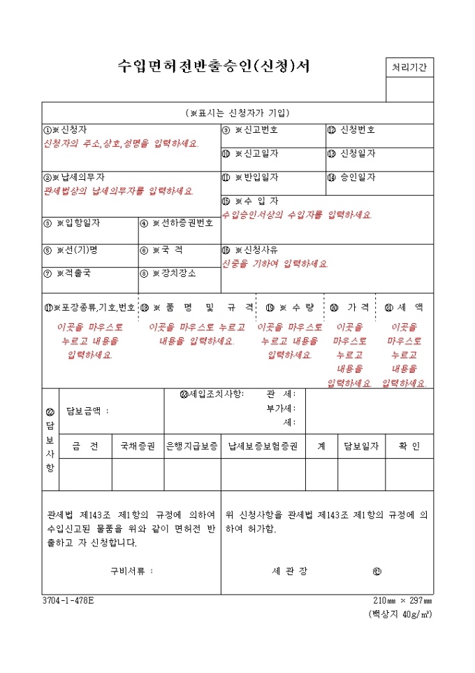 9,000원/월관세법 제143조 제1항의 규정에 의하여 수입신고된 물품을 위와 같이 면허전 반출하고 자 신청하는 수입면허전반출승인(신청)서 양식입니다.