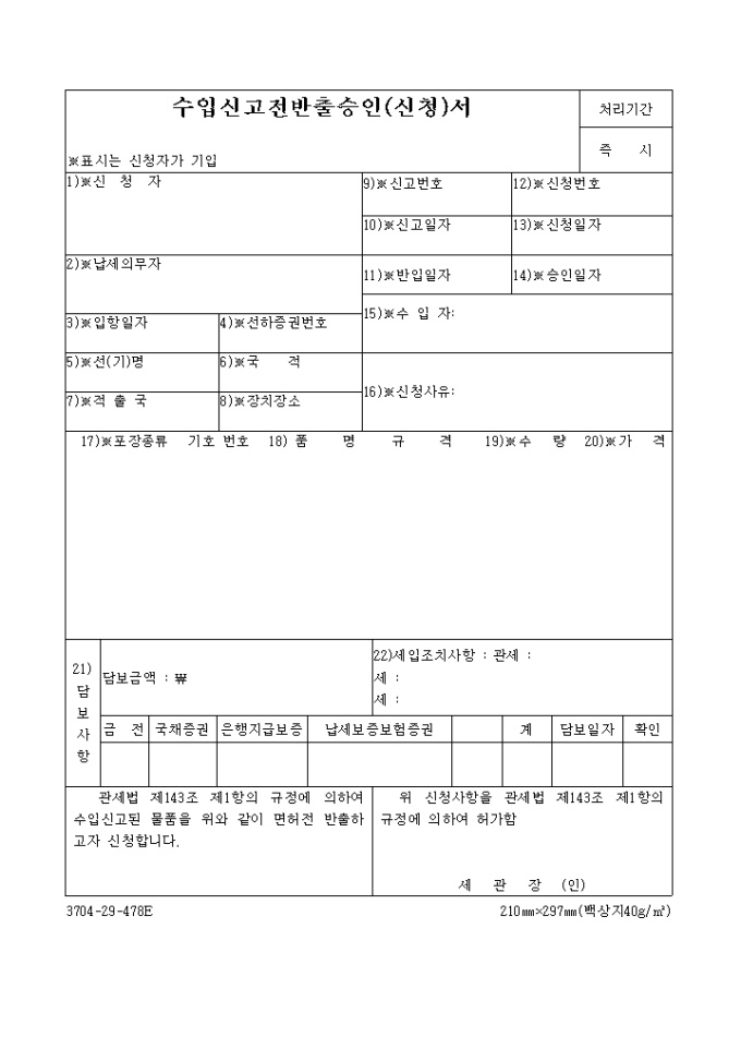 9,000원/월관세법 제143조 제1항의 규정에 의하여 수입신고된 물품을 면허전 반출하고자 신청하는 수입신고전반출승인(신청)서 양식입니다.