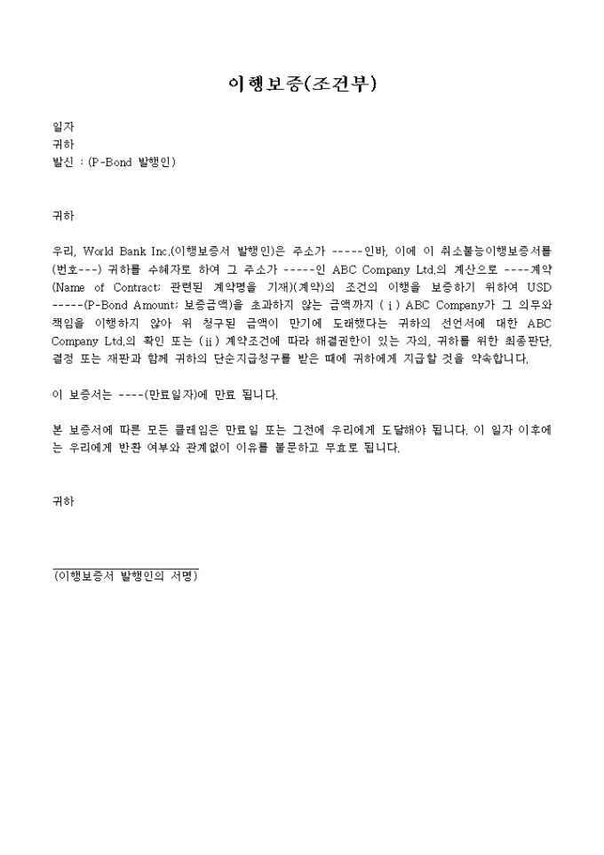 본 보증서에 따른 모든 클레임은 만료일 또는 그전에 우리에게 도달해야 됩니다. 이 일자 이후에는 우리에게 반환 여부와 관계없이 이유를 불문하고 무효로 됩니다. 이행보증(조건부) 양식입니다.