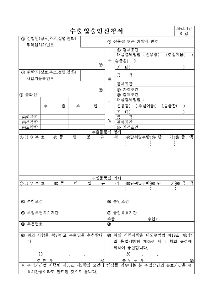 9,000원/월신청사항을 대외무역법 제19조 제1항 및 동법시행령 제25조 제 1 항의 규정에 의하여 승인하는 수출입승인신청서 양식입니다.