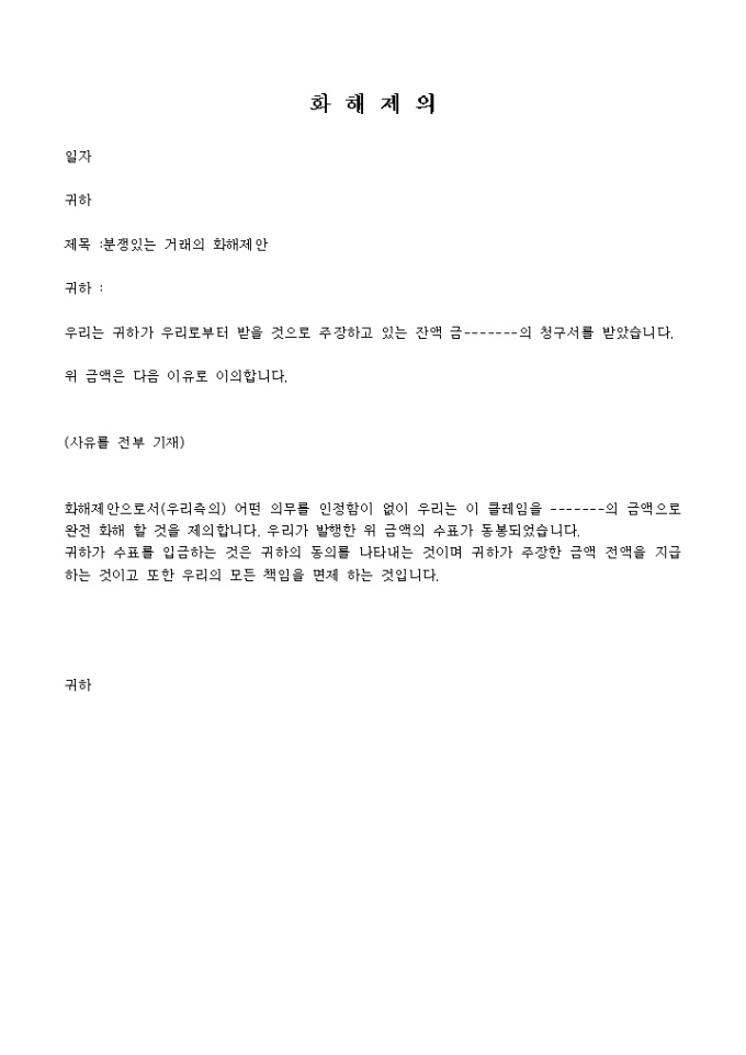 분쟁있는 거래의 화해제안 샘플인 화해제의서 양식입니다.