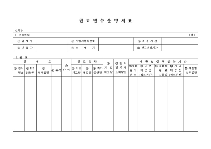 9,000원/월수출업체 및 원료 사항들을 기록하고 명세하는 원료별수불명세표 양식입니다.