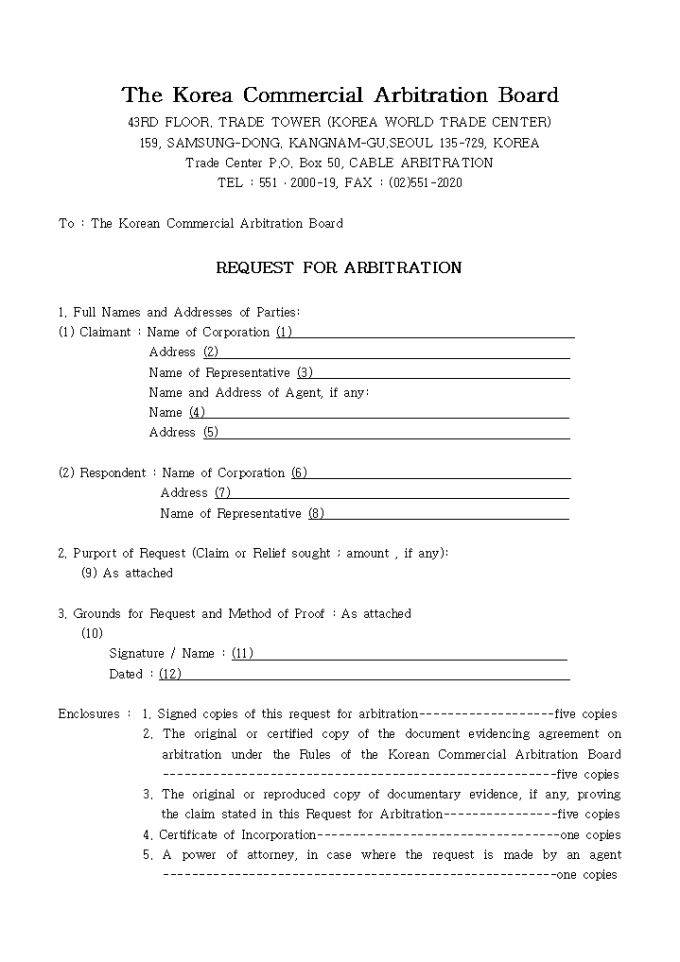 9,000원/월1. Full Names and Addresses of Parties: 2. Purport of Request (Claim or Relief sought ; amount , if any): 3. Grounds for Request and Method of Proof : As attached 중재신청서 양식입니다.