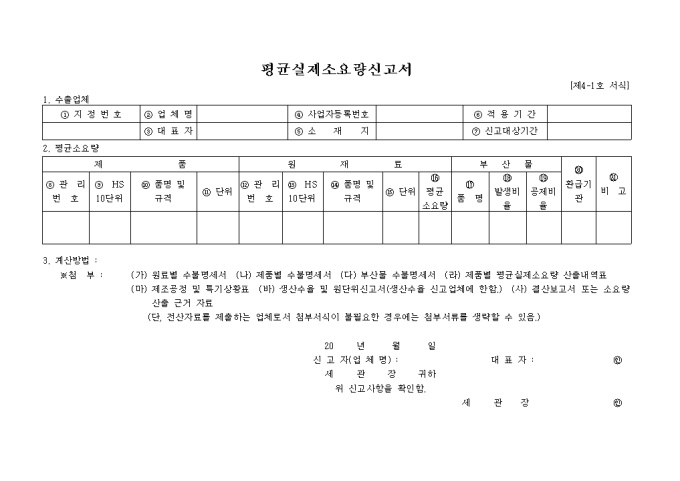 수출업체 및 평균소요량을 기록하고 신고하는 평균실제소요량신고서 양식입니다.