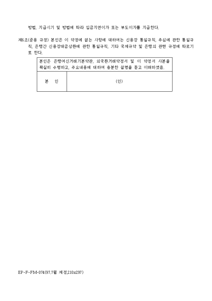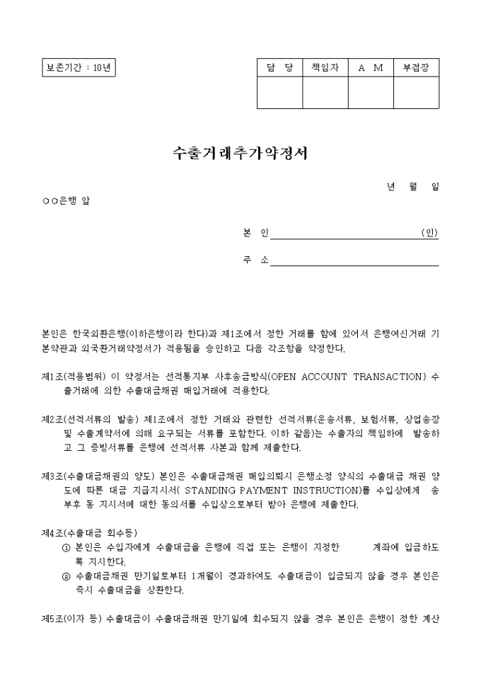 9,000원/월본인은 한국외환은행(이하은행이라 한다)과 제1조에서 정한 거래를 함에 있어서 은행여신거래 기본약관과 외국환거래약정서가 적용됨을 승인하고 각조항을 약정하는 수출거래추가약정서 양식입니다.