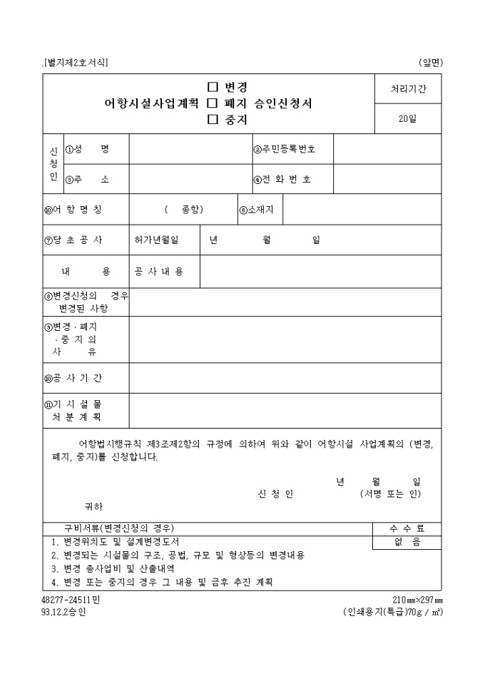 9,000원/월어항법시행규칙 제3조제2항의 규정에 의하여 위와 같이 어항시설 사업계획의 (변경, 폐지, 중지)를 신청하고자 할 때 사용하는 "어항시설 사업계획(변경,폐지,중지) 승인신청서" 양식입니다.