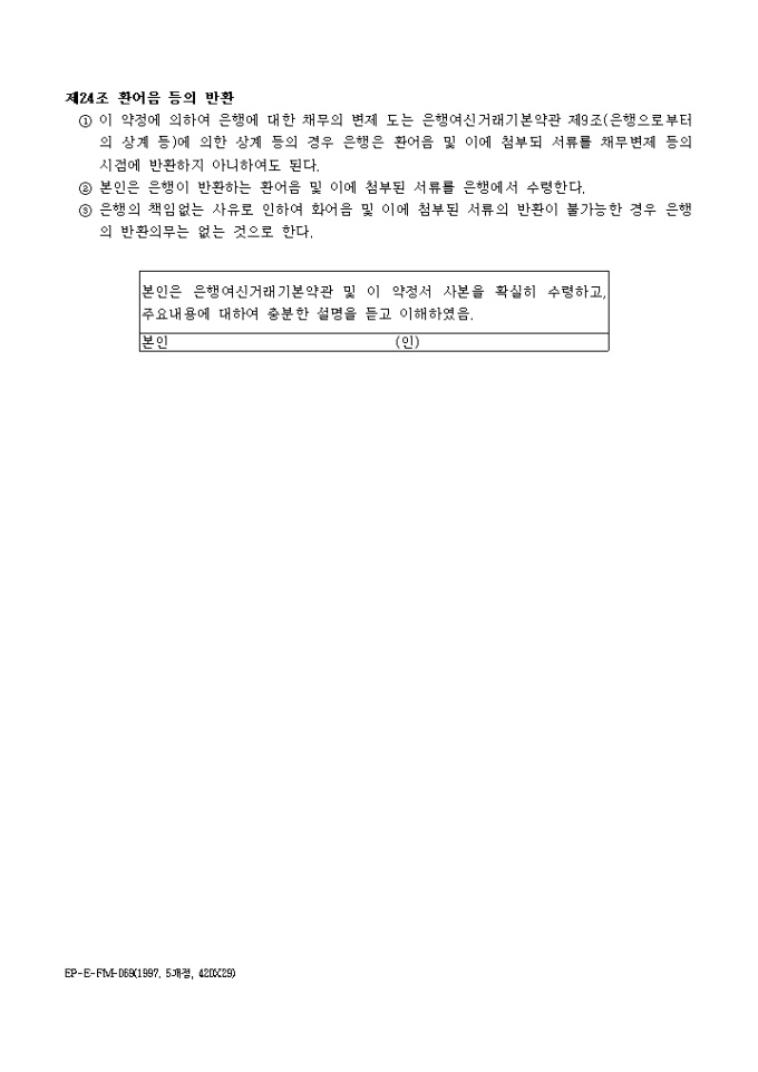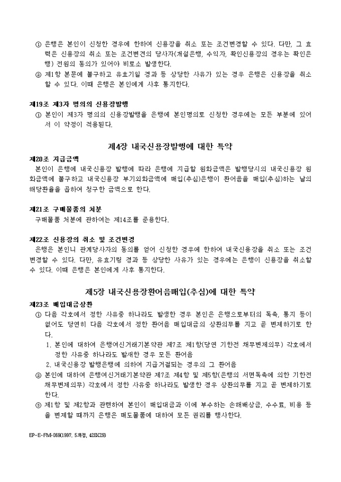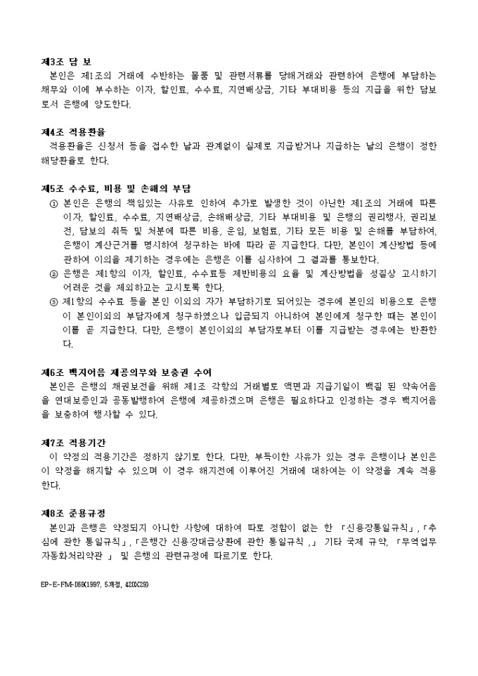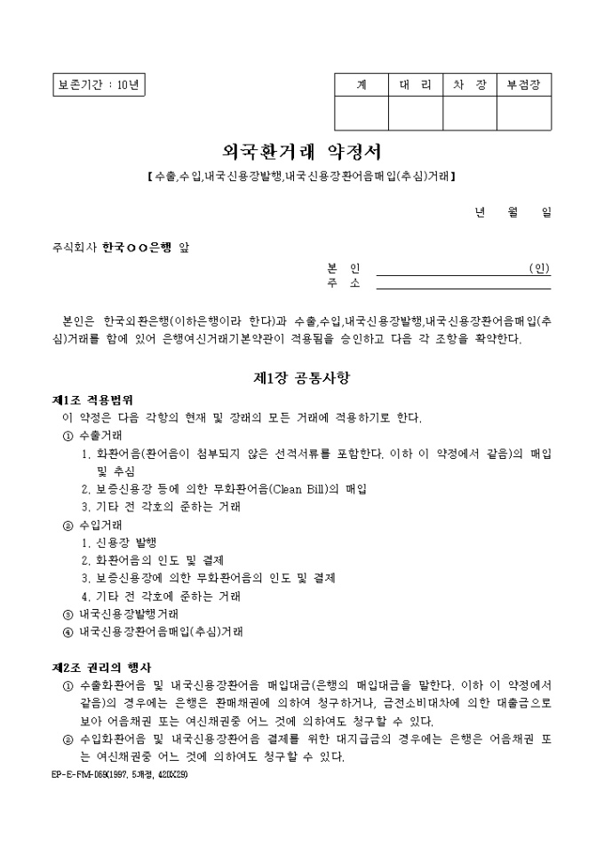 9,000원/월본인은 한국외환은행(이하은행이라 한다)과 수출, 수입, 내국신용장발행, 내국신용장환어음매입(추심)거래를 함에 있어 은행여신거래기본약관이 적용됨을 승인하고 각조항을 확약하는 외국환거래약정서 양식입니다.
