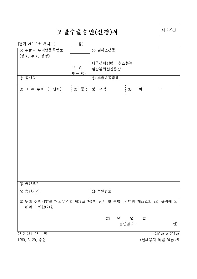 9,000원/월신청사항을 대외무역법 제19조 제1항 단서 및 동법 시행령 제25조의 2의 규정에 의하여 승인하는 포괄수출승인(신청)서 양식입니다.