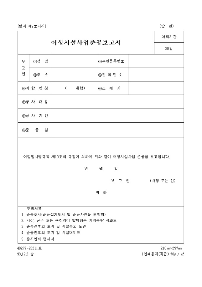 어항법시행규칙 제10조의 규정에 의하여 위와 같이 어항시설사업 준공을 보고할 때 사용하는 "어항시설 사업 준공보고서" 양식입니다.
