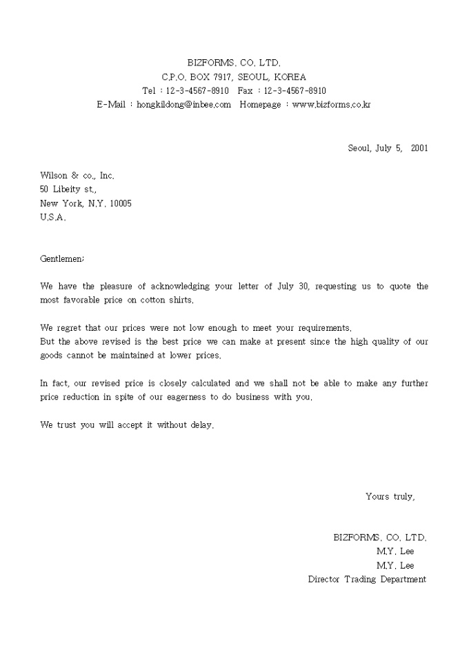 We have the pleasure of acknowledging your letter of July 30, requesting us to quote the most favorable price on cotton shirts. 가격제시(영문) 양식입니다.