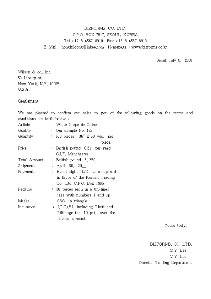 We are pleased to confirm our sales to you of the following goods on the terms and conditions set forth below : 거래확정(영문) 양식입니다.