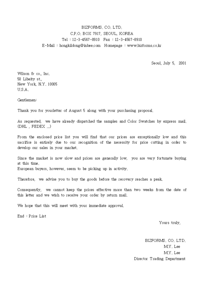9,000원/월Thank you for yourletter of August 5 along with your purchasing proposal. 견적송부(영문) 양식입니다.