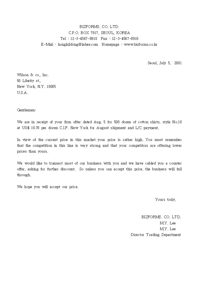 9,000원/월We are in receipt of your firm offer dated Aug. 5 for 500 dozen of cotton shirts, style No.10 at US$ 10.70 per dozen C.I.F. New York for August shipment and L/C payment. 수입가격인하요청3(영문) 양식입니다.
