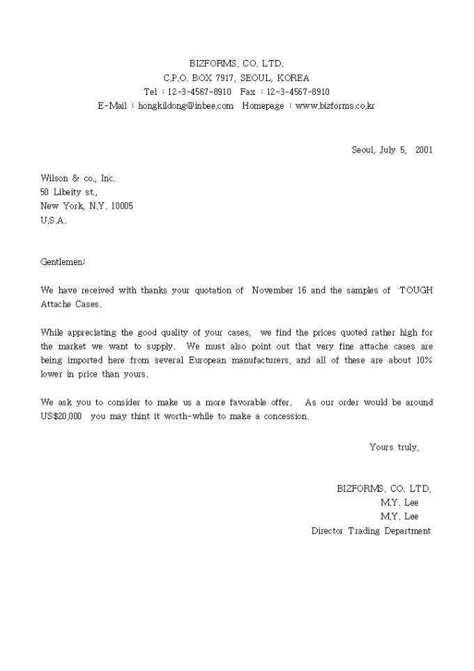 9,000원/월We have received with thanks your quotation of November 16 and the samples of TOUGH Attache Cases. 수입가격인하요청4(영문) 양식입니다.