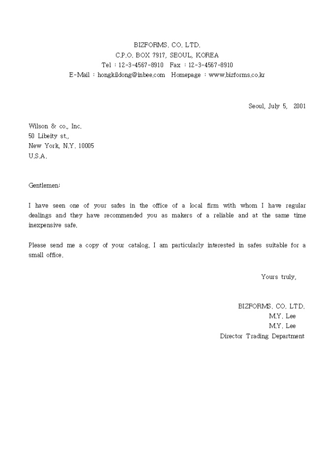 I have seen one of your safes in the office of a local firm with whom I have regular dealings and they have recommended you as makers of a reliable and at the same time inexpensive safe. 수입거래조회1(영문) 양식입니다.