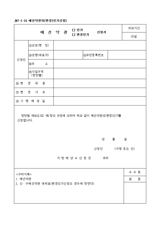 9,000원/월항만법 제34조의2 제1항의 규정에 의하여 위와 같이 예선약관의(변경)인가를 신청하고자 할 때 사용하는 "예선약관(인가,변경인가) 신청서" 양식입니다.
