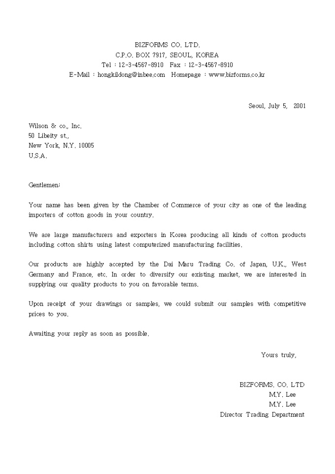 9,000원/월Your name has been given by the Chamber of Commerce of your city as one of the leading importers of cotton goods in your country. 수출거래제의2(영문) 샘플 양식입니다.