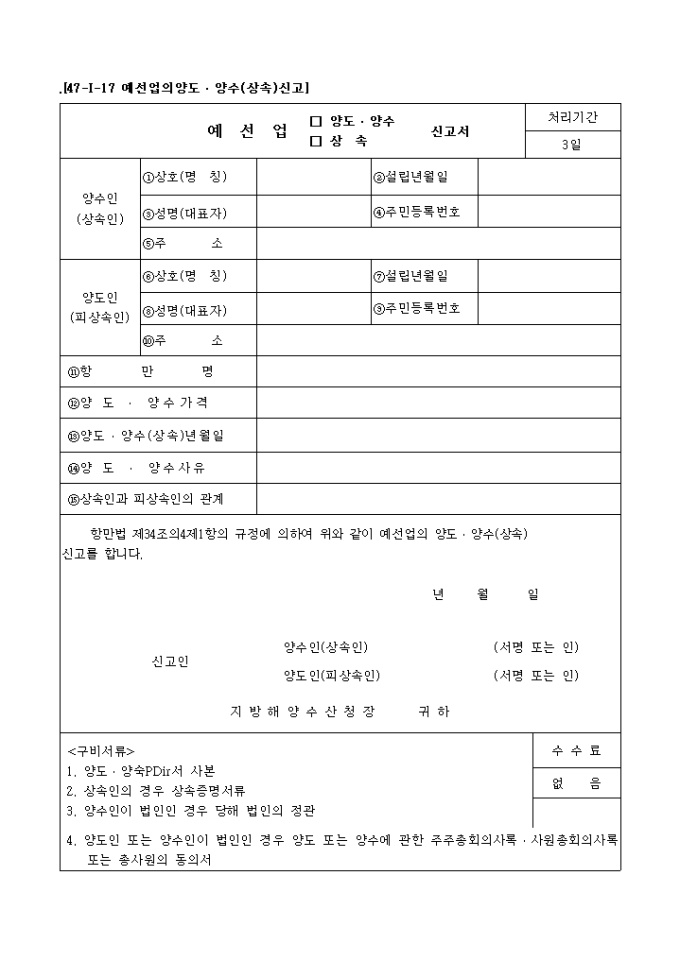 예선업(양도·양수, 상속)신고서