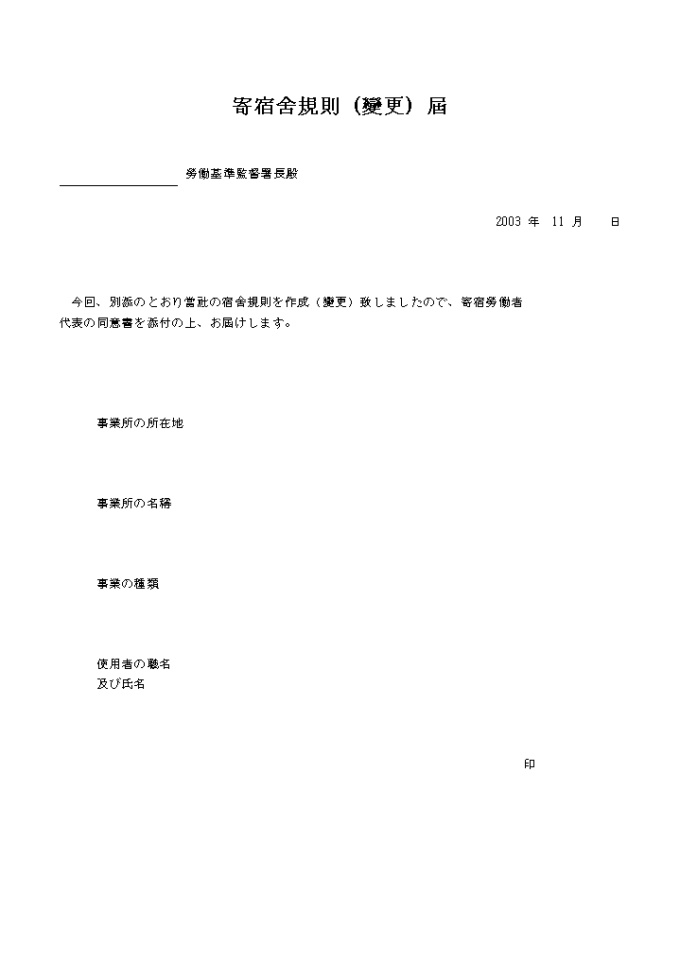 9,000원/월今回, 別添のとおり當社の宿舍規則を作成(變更)致しましたので, 寄宿勞 者 代表の同意書を添付の上, お屆けします. 기숙사규칙(변경)신고(일어) 양식입니다.