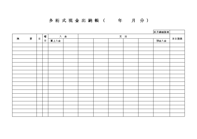 적요, 요일, 입금, 지출, 예금입금 등을 기록하는 다항식현금출납장(일어) 양식입니다.