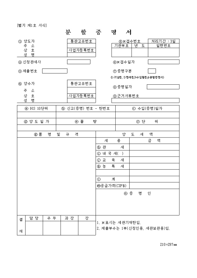 9,000원/월분할 증명서 양식입니다. 양도자, 신청 관세사, 제출 번호, 양수자, 접수번호, 접수 일자, 증명 구분, 증명 일자, 근거 서류 번호 등을 기재합니다.