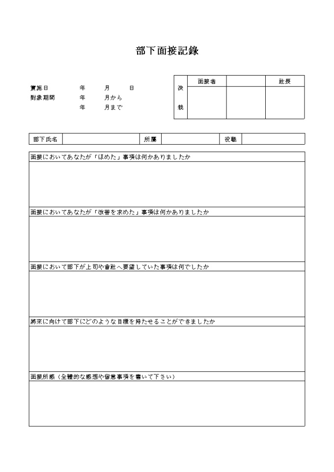 9,000원/월面接においてあなたが「ほめた」事項は何かありましたか 面接においてあなたが「改善を求めた」事項は何かありましたか 面接において部下が上司や會社へ要望していた事項は何でしたか 將來に向けて部下にどのような目標を持たせることができましたか 面接所感(全體的な感想や留意事項を書いて下さい) 부하면접기록(일어) 양식입니다.