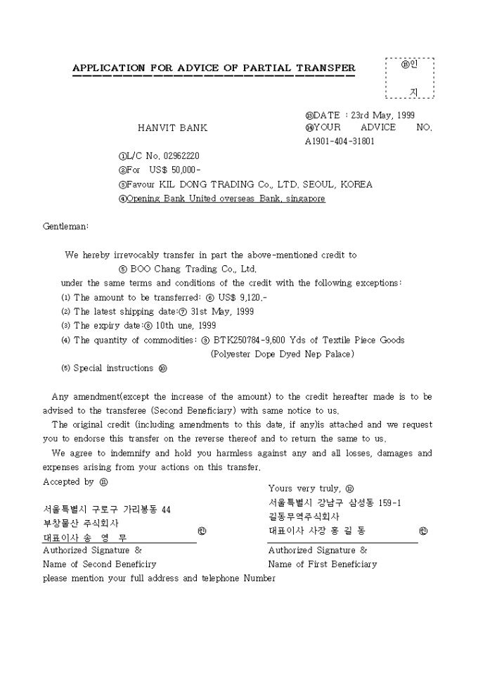 ①L/C No. 02962220 ②For US$ 50, 000- ③Favour KIL DONG TRADING Co., LTD. SEOUL, KOREA ④Opening Bank United overseas Bank, singapore 신용장양도신청서(부분양도) 양식입니다.