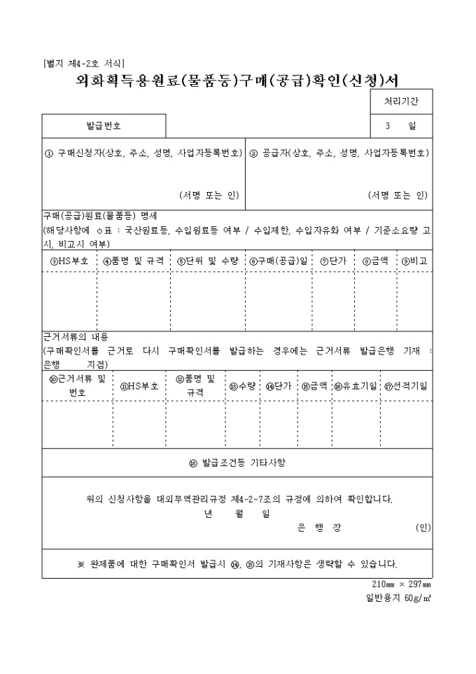 9,000원/월신청사항을 대외무역관리규정 제4-2-7조의 규정에 의하여 확인하는 외화획득용원료(물품등)구매(공급)확인(신청)서 양식입니다.