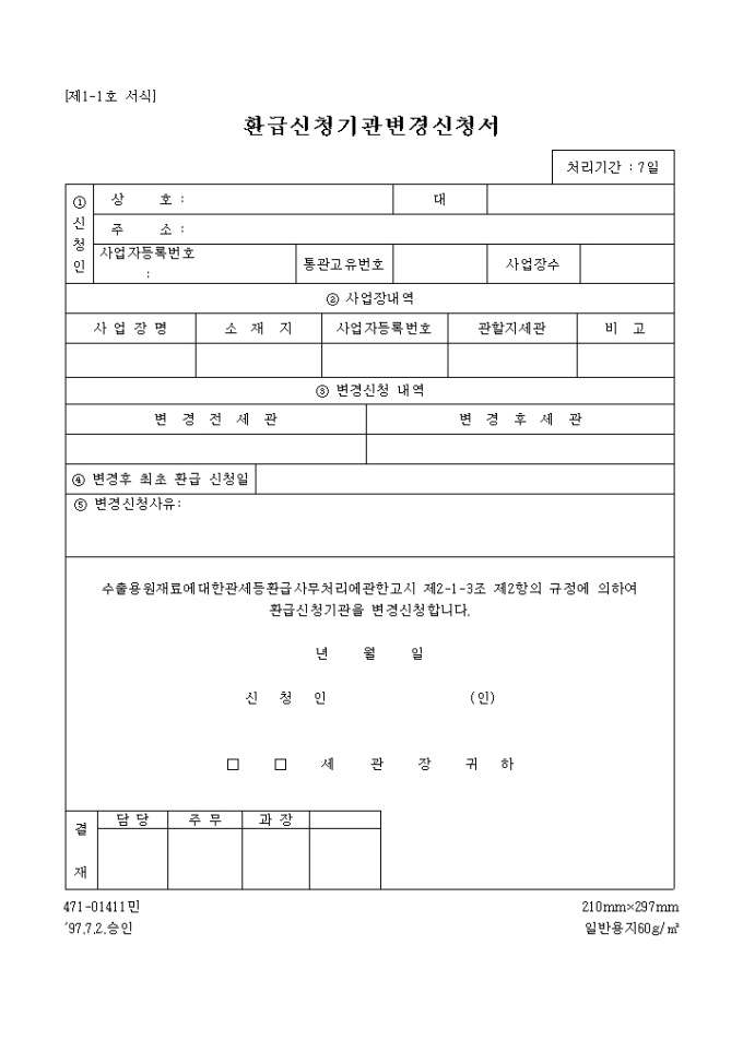 환급 신청 기관 변경 신청서 양식입니다. 신청인의 상호, 주소, 사업자 등록번호와 사업장 내역, 변경 신청 내역, 변경 후 최초 환급 신청일, 변경 신청 사유 등을 기재합니다. 수출용원재료에 대한 관세등환급사무처리에 관한 고시 제2-1-3조 제2항의 규정에 의하여 환급신청기관을 변경신청합니다.